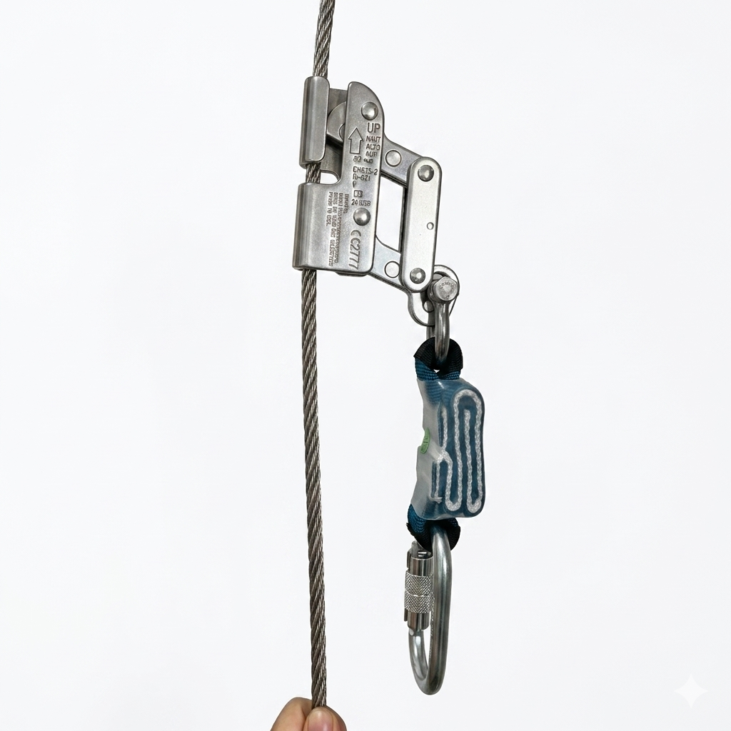 Integrated Shock-Absorbing Tether: The rope grab is permanently linked to an alloy steel karabiner via a PVC-coated stainless steel wire sling. This “ready-to-use” configuration eliminates the risk of using incompatible components.
